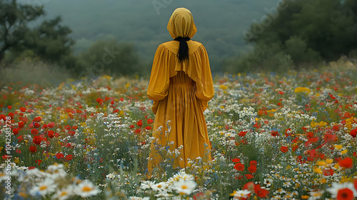 woman, dress, flower, nature, landscape, field, colours, beauty, calmness, outdoors, spring, fashion, scenery, solitude, bloom, flower petals, meadow, vibrant, peaceful, environment, horizon, sunlight, silhouette, flora, garden, rural, scenic, artistic, harmony, leisure, serenity, growth, colours, femininity, warmth, style, elegance, exploration, joy, freedom, connection, earth, wildlife, culture, aesthetic, natural, blossom