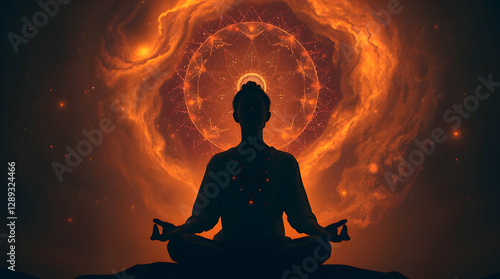 meditating, figure, cosmic, aura, galaxy, star, nebula, radiant, light, energy, universe, spiritual, peace, serenity, balance, transcendence, glow, mystical, aethereal, consciousness, divine, harmony, meditation, celestial, radiance, yoga, silhouette, woman, lotus, exercise, sunset, pose, illustration, vector, health, body, relaxation, sun, relax, sitting, fitness, people, nature, zen, person, icon