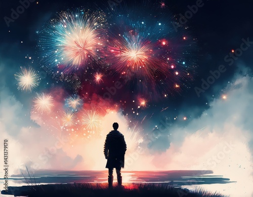 illustration, figure, holiday, celebration, fireworks, night, water, light, man, colours, sky, peace, display, festival, silhouette, sparkle, beautiful, atmosphere, wonder, magic, dusk, calmness, happiness, illumination, scenery, moment, festive, culture, tradition, appreciation, enjoyment, festivity, romance, imagination, euphoria, serenity