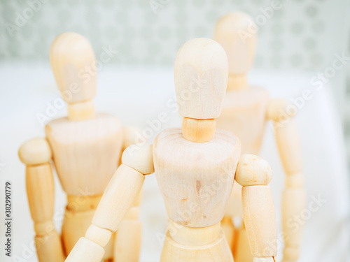 A figurine of a wooden man on hinges against the background of two other figures. Photo with focus in the foreground