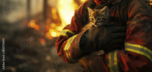firefighter, cradling, kitten, hand, professional, profession, fire, rescue, emergency, people, fireman, job, adult, occupation, equipment, department, dial 911, fighter, burning, structure, flames, smoke, safety, compassion, animal, heroism, care, tenderness, danger, bravery, uniform, response, heat, crisis, building, pet, scene, intensity, survival, protective, aftermath, destruction, relief, emotional, action