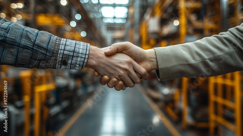 A firm handshake symbolizes partnership and collaboration in a logistics warehouse environment, showcasing teamwork and agreement.