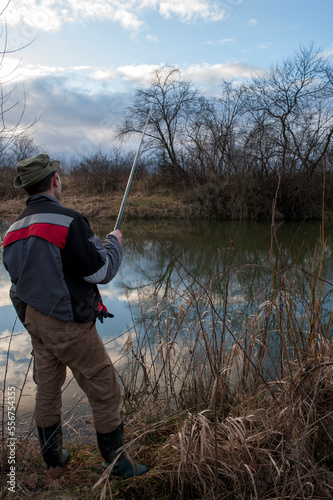 a fisherman on the shore of a pond pulls a spinning fish on a cloudy day
