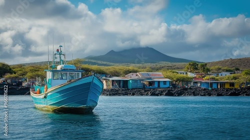 A fishing boat anchored near a Galapagos village, highlighting the community's connection to the sea.
