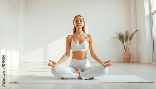 A fit woman meditates in a lotus position on a yoga mat, dressed in flowing white attire, exuding serenity in a bright, airy yoga studio with wooden flooring and a soft pastel color sch