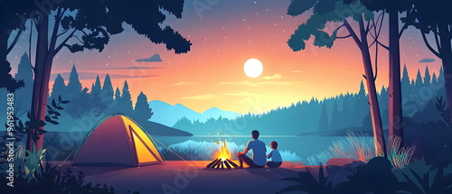 family, camping, flat, illustration, relaxed, pose, tent, campfire, vibrant, colours, background, serene, forest, lake, distance, twilight, sky, setup, outdoors, nature, adventure, evening, sunset, wilderness, peaceful, gathering, scene, warmth, togetherness, bonding, campground, glow, tree, calm, journey, vacation, summer, escape, fire, fun, tranquil, leisure, get-away, enjoyment, relaxation, timberland