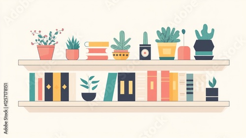 A flat design illustration of a bookshelf filled with books, plants, and small decorative items, AI Generative.