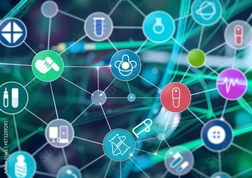 A flat design illustration of interconnected medical icons forming an intricate network