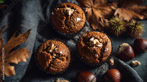 A flat lay of chestnut muffins with cracked tops, surrounded by leaves and pine