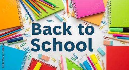 A flat lay of colorful school supplies with back to school text on a white background spread out