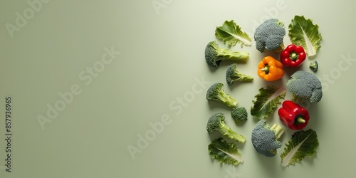 A flat lay of fresh vegetables including broccoli, bell peppers, and lettuce , arranged on a light green background. Top view. Copy space.