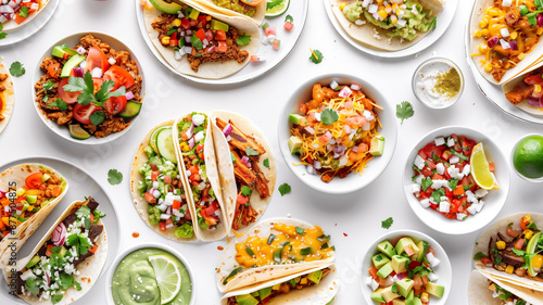 A flat lay of multiple taco Mexican food dishes arranged aesthetically on a white background, highlighting the variety of fillings and toppings. Ai generated
