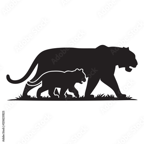 A flat silhouette of a tiger and cub, both walking side by side, creating a family-friendly logo, black silhouette on a white background.