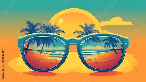 A flat vector illustration of classic sunglasses on a beach towel, with lenses reflecting a vivid beach scene—palm trees, ocean waves, and a bright yellow sun in a clear sky.