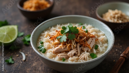 porridge, rice, asian, soup, meat, shredded, herb, lime, shallot, crispy, bowl, food, cookery, delicious, tasty, dinner, lunch, homemade, fresh, cooked, meal, dish, culinary, epicure, still life, wooden, surface, ingredient, cilantro, green, onion, closeup, studio, lighting, alimentary, healthy, comfort, warm, simple, country