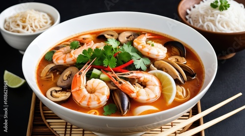 seafood, shrimp, clam, mushroom, herb, lime, cilantro, rice, bowl, asian cuisine, chopstick, broth, epicure, delicious, fresh, savoury, culinary, meal, soup, ethnic food, appetising, dish, cookery, noodle, garnish, vibrant, aromatic, dining, healthy, traditional, eatery, plate, tasty, hot, steaming, favor, culinary arts, soup bowl
