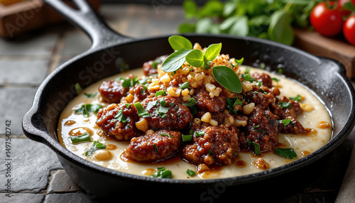 A flavorful skillet dish showcases sausage atop creamy grits, garnished with fresh herbs and crunchy nuts, perfect for hearty dining
