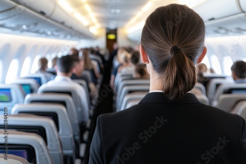 A flight attendant in a stylish uniform looks back at the passengers, establishing a reassuring presence and contributing to the overall comfort during the flight.