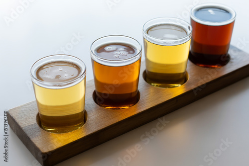 A flight of beer samples on a wooden tray with four glasses of different colored beers close up