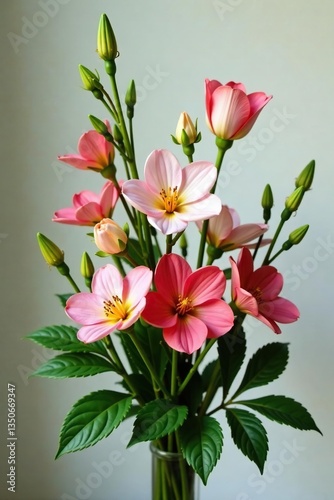 A floral bouquet with long stems and delicate leaves in a symmetrical arrangement, leafy greens, flowers