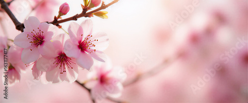 A floral explosion of cherry blossom petals in full bloom against a soft pastel background, capturing the essence of early spring with gentle diffuse sunlight filtering through branches. Diverse flowe
