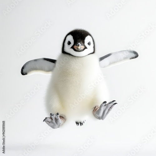 penguin, bird, chick, animal, cute, fluffy, baby, nature, wildlife, antarctica, arctic, black, white, wing, beak, foot, feather, small, leap, jump, flying, flight, isolated, adorable, funny, happy, joy, playful, sweet, creature, background, white background