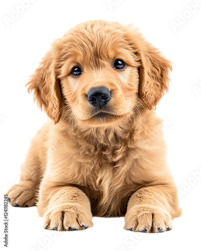 A fluffy golden retriever puppy lying on its stomach with its paws in front of it. The puppy has a golden-brown coat and big, expressive eyes.