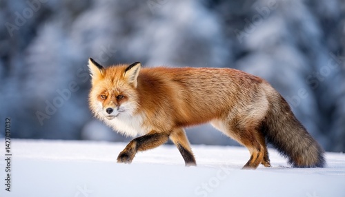 a fluffy red fox walks on white snow in a winter forest against a blurred background of snow covered trees