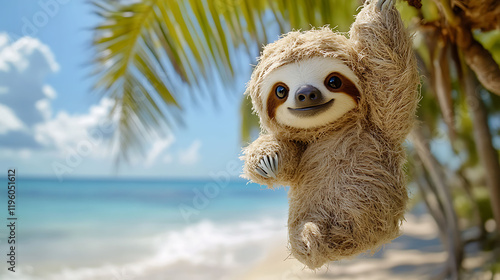 A fluffy stuffed sloth hanging from a palm tree on sunny beach playful