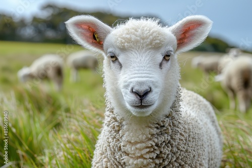 A fluffy white lamb with a small bell around its neck, standing in a green pasture with other sheep grazing in the background