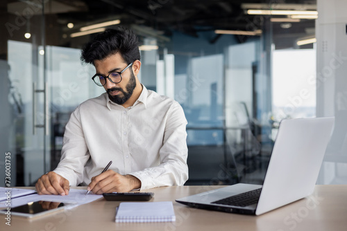 A focused and serious young Indian man works as an accountant, auditor, and financial analyst. Sitting at the desk in the office and working with accounts and data