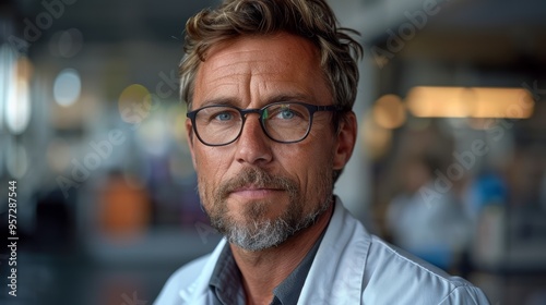 A focused healthcare professional wearing a lab coat, captured in a modern medical facility amidst a busy day of consultations