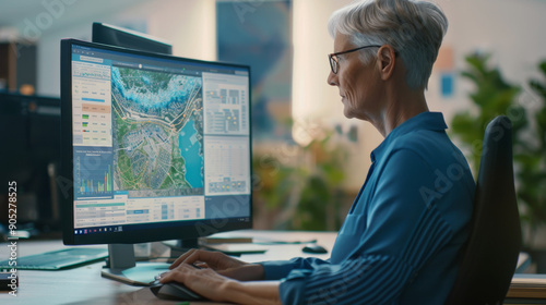 A focused individual analyzes maps and data on a large computer screen in a well-lit office, showcasing dedication to precision and information.