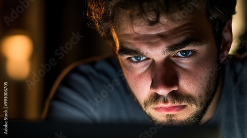 A focused man gazes intently at a screen in a dimly lit environment, highlighting concentration and engagement with digital content.