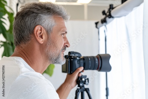 A focused middle-aged photographer with a camera poised, ready to take a photo in a beautifully lit studio, showcasing his passion for photography and art.