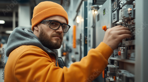 A focused technician in an orange beanie and hoodie operates a control panel inside an industrial facility, wearing safety goggles and adjusting components carefully.