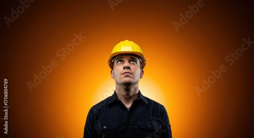 A focused worker in a bright yellow hard hat gazes upward against a warm orange backdrop.