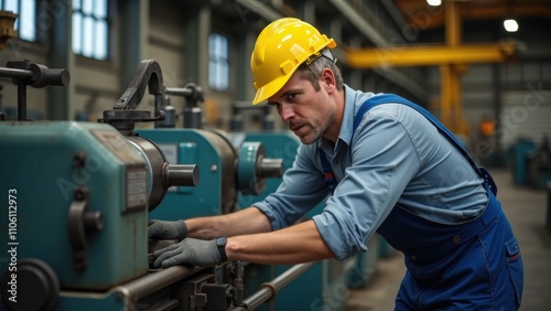 A focused worker wearing a safety helmet and gloves carefully adjusts a piece of machinery in a bustling industrial workshop, showcasing expertise in handling equipment