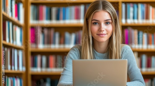 A focused young woman studies diligently with her laptop in a cozy library, surrounded by shelves full of books, embodying academic dedication.