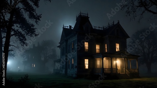 A foggy evening where the silhouette of a haunted house looms ominously, its exterior adorned with weathered shutters and broken windows ai_generated