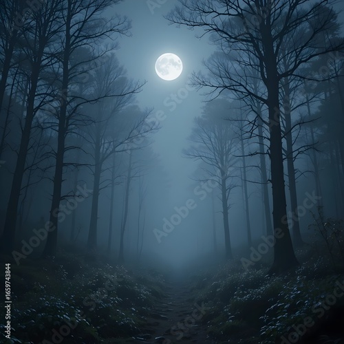 A foggy forest illuminated by moonlight, silvery dew sparkling