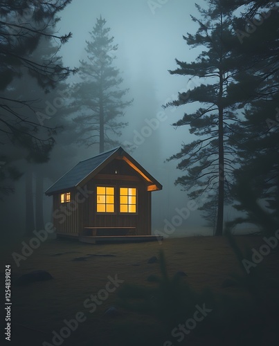 A foggy forest with a warmly lit cabin, symbolizing solitude, peace, and the charm of remote wilderness living