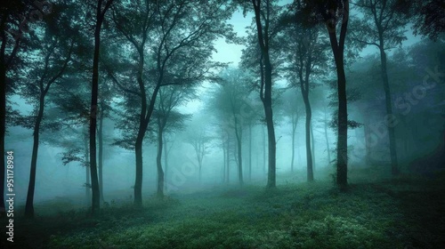 A foggy forest with tall, dark trees standing close together, creating an eerie yet beautiful atmosphere.