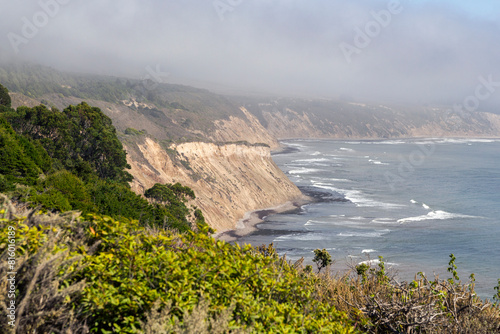 cliff, mountain chain, mountain, vista, fog, hiking, path, mist, rock, coastal, coastline, bay, tour tourism, scenic, formation, geologic, cliff, daylight, ocean, coast, beach, pacific, famous, california, unique, iconic, vegetation, tree, forest