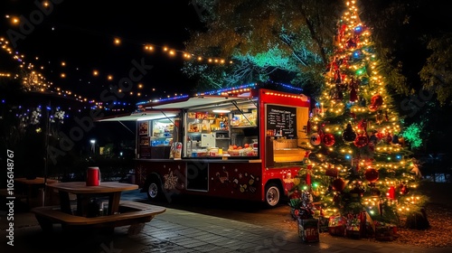 A food truck decorated with garlands and holiday lights next to a decorated Christmas tree. There is a festive atmosphere all around, garlands of lights illuminate the space.