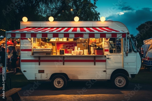 A food truck with a vibrant red and white awning, parked on the side of the road, ready to serve customers with delicious meals, Food truck with striped awning at a fair, AI Generated