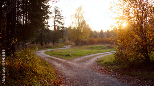 A forked path through a golden autumn forest, symbolizing life's choices under soft sunlight.