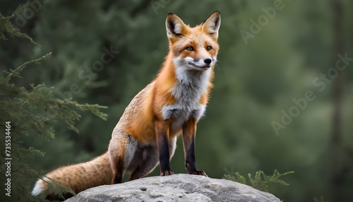 A formidable Fox standing on a rock surrounded by trees and vegetation. Splendid nature concept.