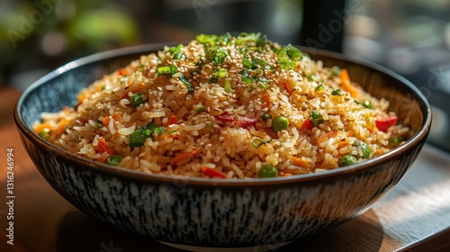 A fragrant mound of fried rice in a vibrant ceramic bowl, adorned with colorful vegetables and glistening sesame seeds, a testament to the joy of simple culinary pleasures.