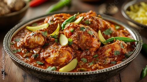 A fragrant, slow-cooked Pakistani-style chicken karahi with a thick on blurred background
